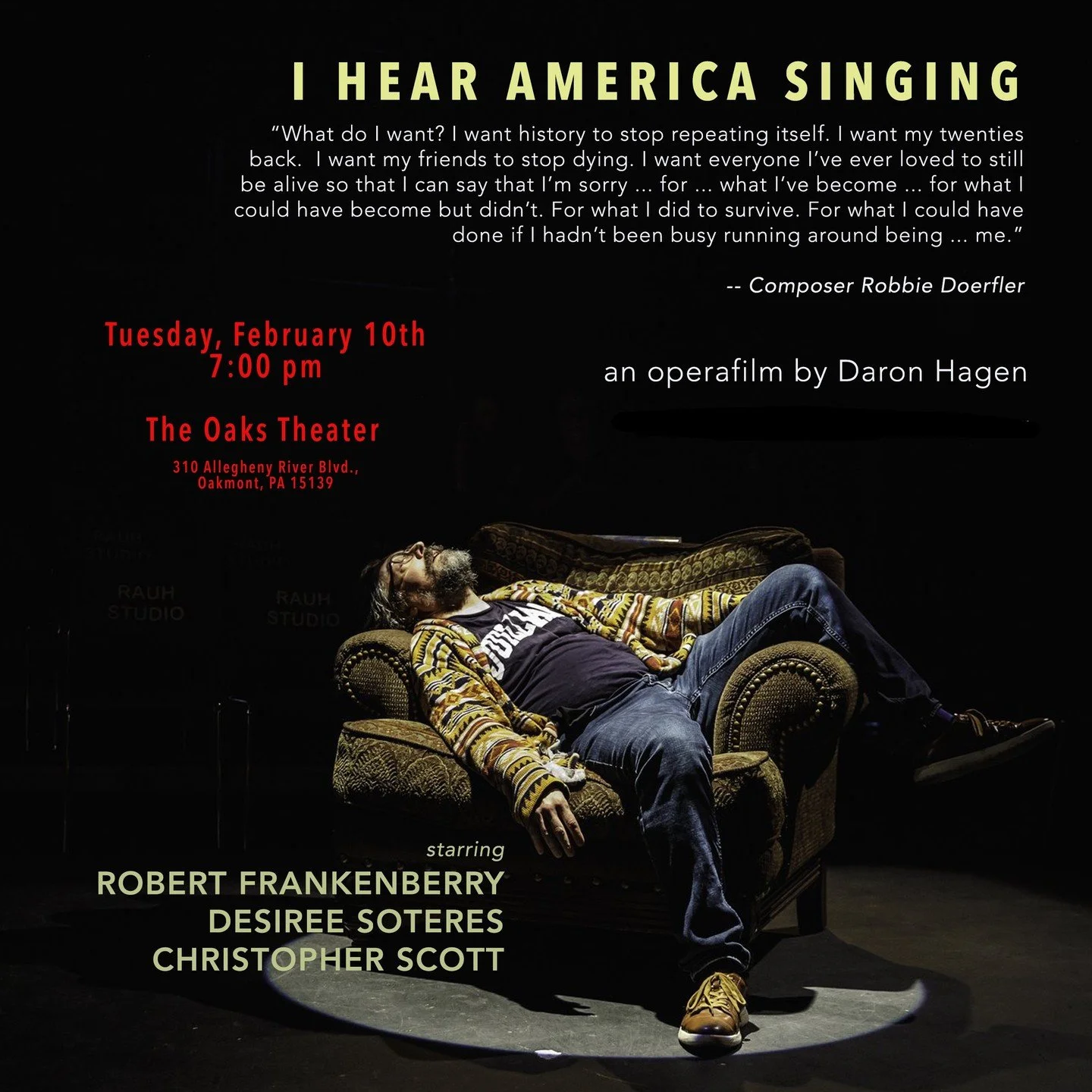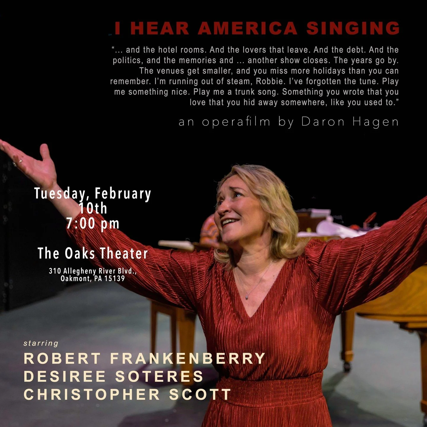 I Hear America Singing world premiere screening on 10 February 2026 in Pittsburgh at the Oaks Theater, presented by Aria 412. Tickets here.